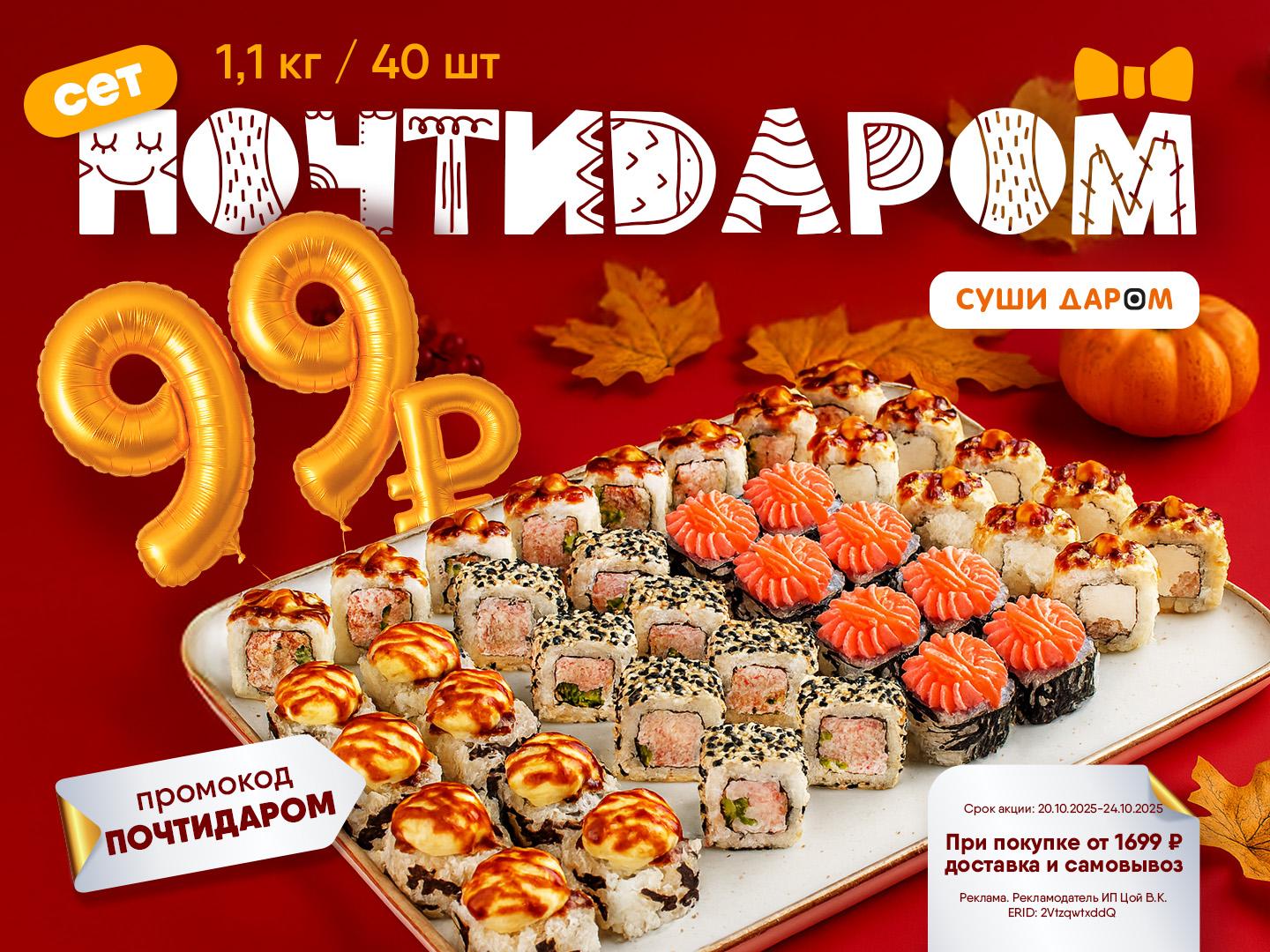 [emoji=:heart_eyes:]Никаких уловок — всё просто сделай заказ на сумму от 1699 рублей и добавь к заказу сет “Почти Даром” всего за 99 ₽.[br][emoji=:orange_heart:] Просто используй промокод ПОЧТИДАРОМ при оформлении заказа.[br][br]Сет “Почти Даром” - идеальный способ сделать ужин разнообразнее: добавить ещё порцию роллов, поделиться с друзьями или устроить гастро-вечер без лишних затрат.[br][br]• Акция действует с 20 по 24 октября 2025 года.[br]* Не суммируется с другими предложениями на самовывоз[br]**Списание баллов UDS невозможно[br]***Количество товара ограничено, наличие товара уточняйте у кассира по телефону 8 (963) 389-29-29